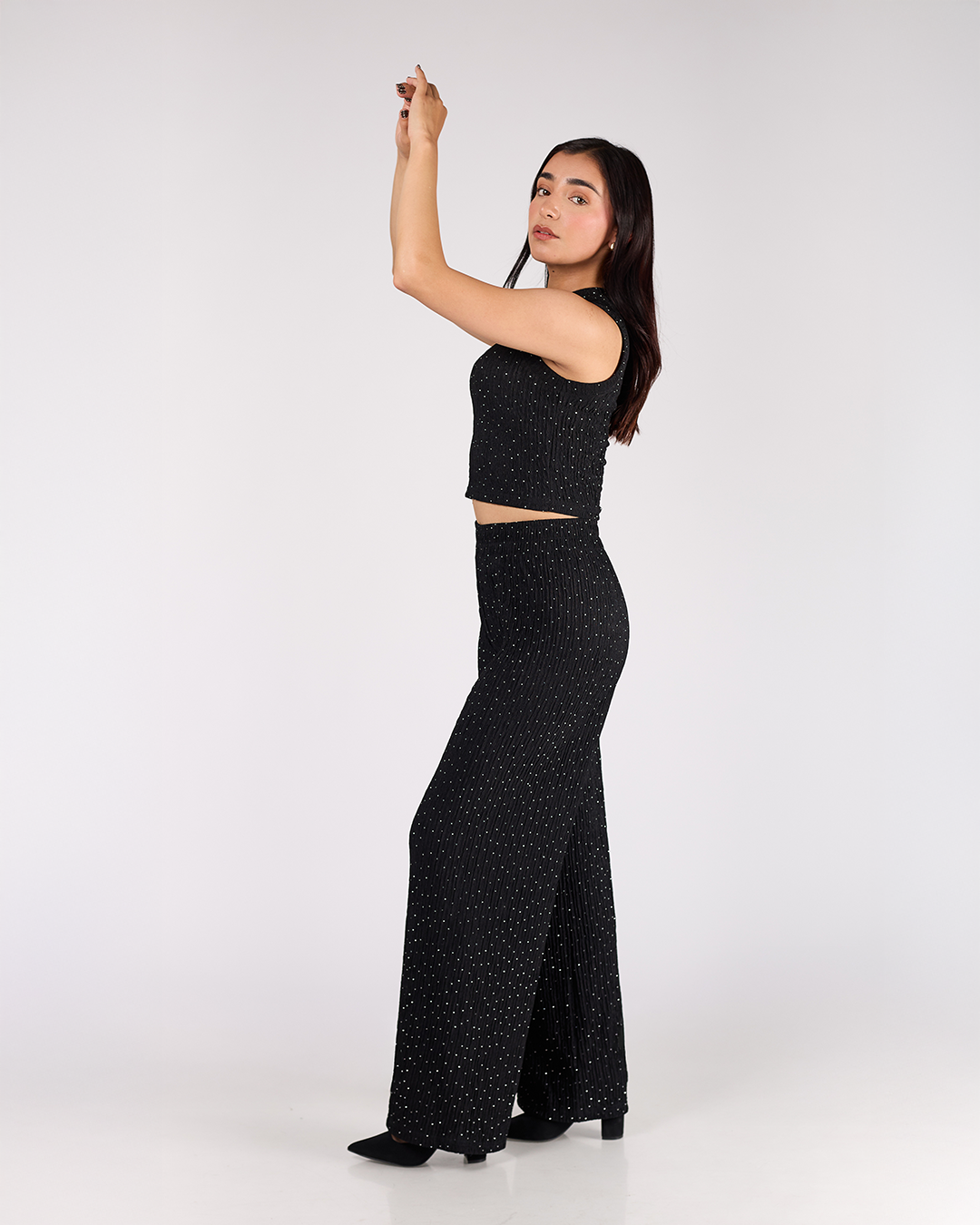 Conjunto de piezas en tela ligera texturizada con brillos: