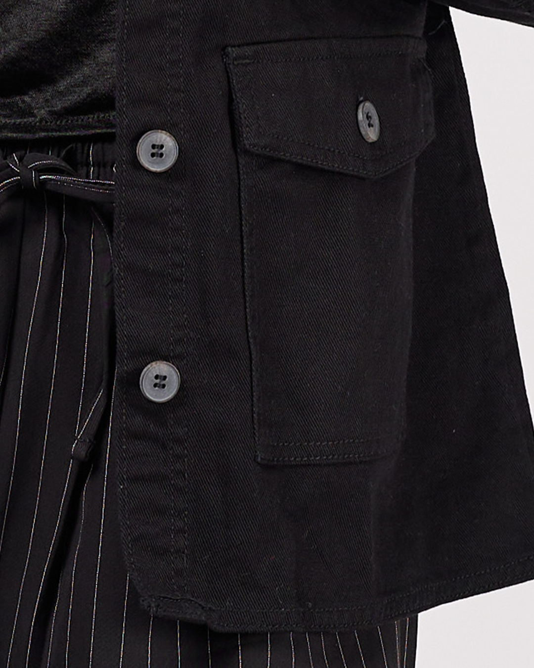 Chamarra de gabardina con cuello de pana, botones al frente, bolsas laterales tipo cargo con botones.